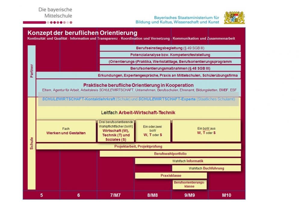 Das besondere Profil der bayerischen Mittelschulen ist die starke Berufs- und Praxisorientierung im Fach Arbeit-Wirtschaft-Technik sowie in den berufsorientierenden Zweigen Technik, Wirtschaft und Soziales. Der Unterricht unterstützt die Schülerinnen und Schüler dabei, ihre Interessen und Wünsche, ihr Wissen und Können mit den beruflichen Anforderungen und dem Bedarf der Arbeits- und Berufswelt abzustimmen.
