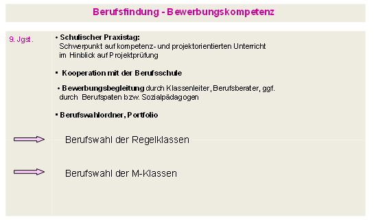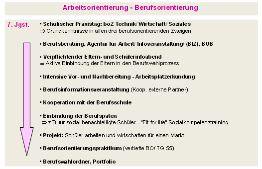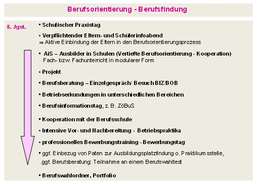Alle unterrichtlichen Maßnahmen sollen dazu beitragen, dass Schüler den Wert einer qualifizierten Berufsausbildung erkennen und einsehen, wie sehr es in allen Berufen neben fachlichem Können auch auf soziale und personale Kompetenzen ankommt.Am Ende dieses Prozesses sollen Schüler die Berufswahlreife erreicht haben: Sie sollen vorbereitet sein, selbst Verantwortung zu übernehmen, indem sie sich für einen Erstberuf entscheiden und schließlich auch erfolgreich zu bewerben.