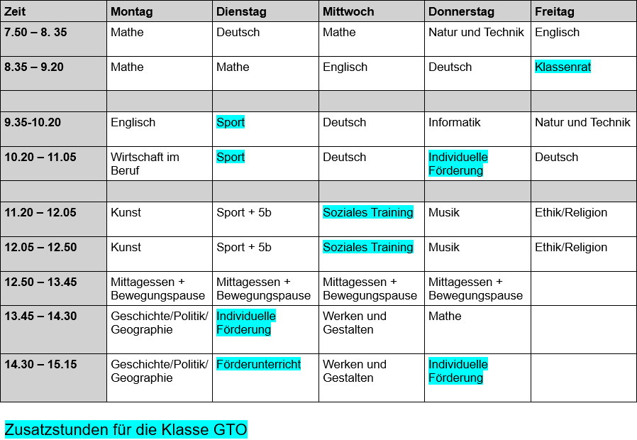 Die Schülerinnen und Schüler der GTO werden abhängig von ihren kognitiven Fähigkeiten und Leistungsständen und in Anlehnung an ihre jeweilige Jahrgangsstufe (5., 6. oder 7. Klasse) in der GTO beschult. Jedes Kind arbeitet individuell. Schülerinnen und Schüler, die sich im zweiten GTO-Jahr befinden, werden stundenweise in die Regelklasse zurückgeführt. Dies erfolgt in einem Fach, in dem gute Ergebnisse erzielt werden können. Die Rückführung wird von der Sozialpädagogin begleitet, um den Übergang in die Klasse zu erleichtern.
