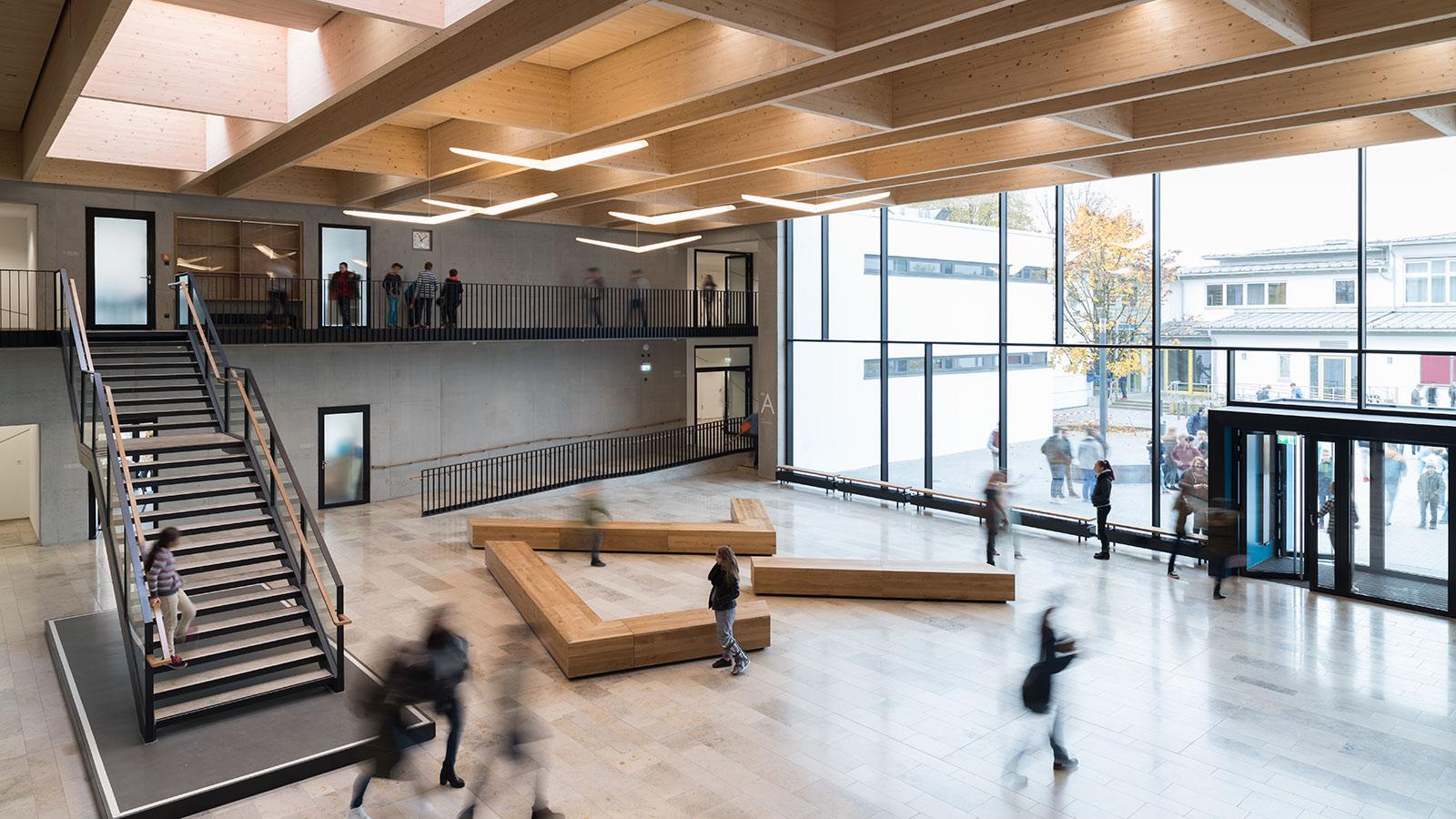 Unsere helle, lichtdurchflutete Aula ist das Zentrum unserer Schule.