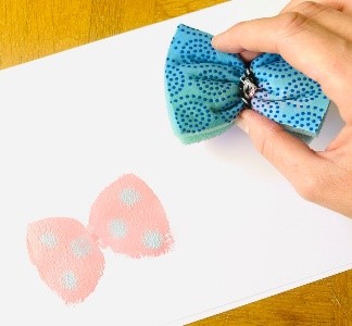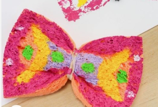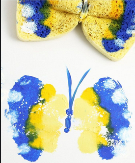 Anschließend trägst du auf jede Flügelhälfte des Schwamms Farbe auf- so bunt, wie es dir gefällt.