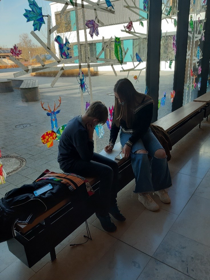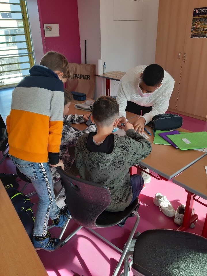 Nachdem sich die Ethikschüler:innen der 10. Klassen und die neuen 5. Klässler:innen kennengelernt hatten, ging es daran im Rahmen des Musikunterrichts einen eigenen Rap-Text zu schreiben. Nach dem Vorbild eines baden-württembergischen Rap-Wettbewerbs arbeiteten sich die Schüler:innen durch die einzelnen Phasen: Thema finden; Brainstorming; die Ideen in einfachen Sätze aufschreiben, um sie - in einem letzten Schritt - in passende Reime umzuformulieren.