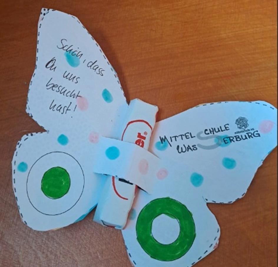 Dazwischen berichteten die Grundschüler von ihrer Schulzeit, ihren Lieblingsfächern, dass sie schon Geschwister hier hätten, wer nach der 4. Klasse welche Schule besucht usw. Es wurde viel gefragt und sehr eifrig gearbeitet! Die Zeit verging viel zu schnell, aber schließlich wurde ja noch eine zweite Schülergruppe aus Reitmehring und Soyen erwartet. Die kam dann kurz vor 11.00 Uhr und das Programm startete von Neuem. Der spannende Vormittag endete für jede „Gastschule“ mit einer fröhlichen Verabschiedung. Dies übernahmen unsere jüngsten Schüler aus der Musikgruppe von Frau Kränzlein mit einem tollen Lied. Zur Erinnerung an den Besuch in der Mittelschule Wasserburg erhielt jedes Grundschulkind noch einen „süßen“ Schmetterling, auf den die 8. Klassler Soziales geschrieben hatten: „Schön, dass Du bei uns warst!“