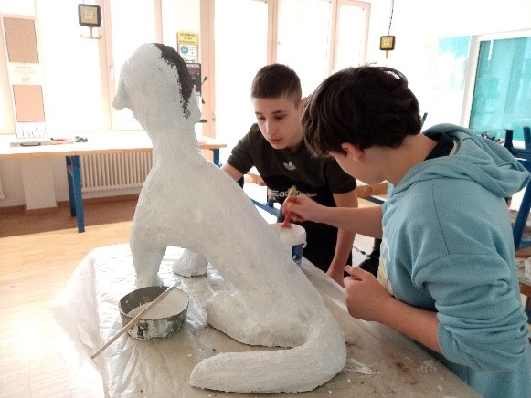 Zuletzt wurde der Hund noch bemalt und erstrahlt nun in einer wunderschönen Farbkombination. Jeder Schüler durfte für sich noch einen Napf oder Vogeltränke aus Beton bauen, so dass jeder auch etwas mit nachhause nehmen konnte. Die Klasse hat sich auch für den „Betonaward“ beworben und warten nun gespannt auf das Ergebnis, das Mitte Juni kommen soll. "Ich finde es toll, dass wir so eine einmalige Chance bekommen haben mit einem erfahrenen Künstler zusammenzuarbeiten", berichtet ein Schüler der Praxisklasse. "Dank des Projektes haben wir nicht nur unsere praktischen Fähigkeiten verbessert, sondern auch viel über Teamarbeit gelernt. Es war cool zu sehen, wie aus unseren Ideen und Vorstellungen ein wirklich beeindruckendes Kunstwerk entstanden ist", ergänzt ein weiterer Schüler.