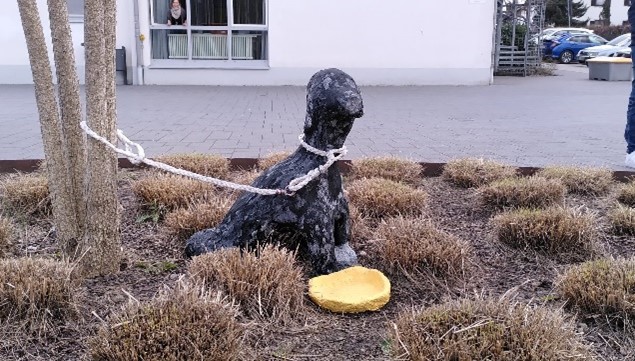 Die Schüler der Praxisklasse an der Mittelschule Wasserburg haben in Kooperation mit dem Künstler Herrn Krebs von Kreartland einen Hund in Lebensgröße aus Beton modelliert. Das beeindruckende Projekt fand in insgesamt drei Terminen während des Technikunterrichts bei Herrn Schrag statt. Dabei haben die Schüler unter Anleitung von Herrn Krebs ein Grundgerüst aus Draht und Drahtgitter gebaut. Anschließend wurde der Beton im richtigen Mischungsverhältnis aufgetragen. Dabei war Vorsicht geboten, denn zu viel oder zu wenig Sand hätte den Beton zum Abbröseln gebracht oder ihn nicht am Drahtgeflecht gehalten.