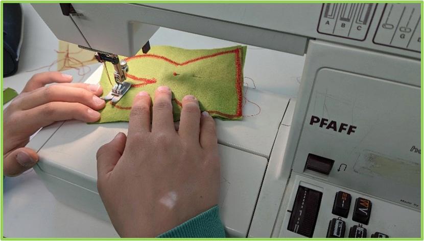 Die 5b setzt sich im WG-Unterricht intensiv mit dem fachgerechten Umgang der Nähmaschine auseinander. In mehreren Unterrichtseinheiten wurde die Entstehung der Nähmaschine erkundet, der sichere Umgang besprochen, das Einfädeln des Ober- und Unterfadens geübt und natürlich auf Papier und Stoff mit unterschiedlichen Stichen genäht.