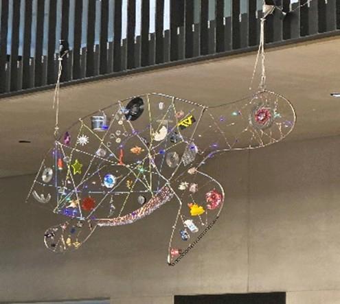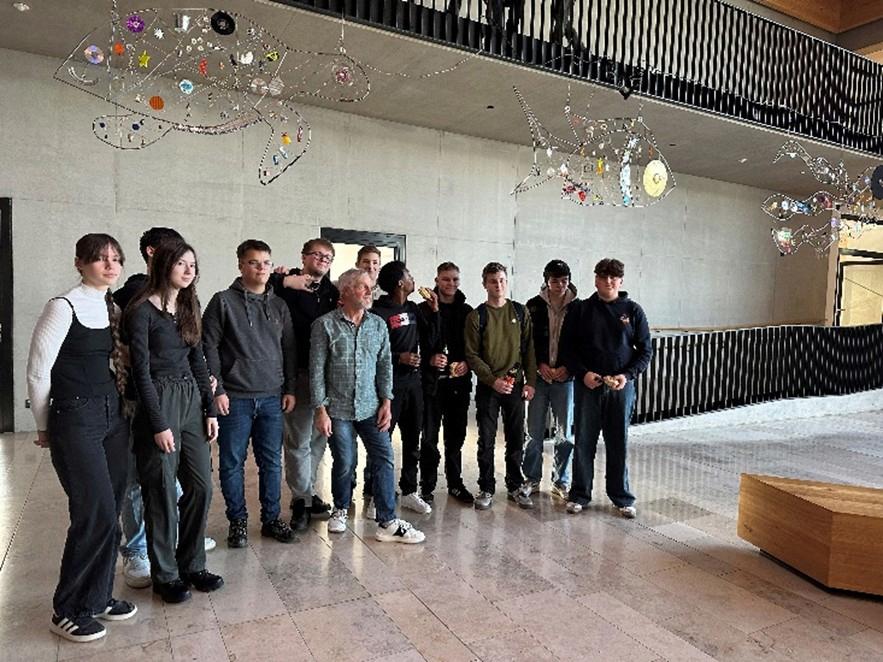 In diesem Schuljahr werkten die Technik-Schüler der 10A und 10B von November bis Januar an einer künstlerischen Metall-Skulptur in Anlehnung an ein Kunstwerk von Alexander Calder. Es wurden nach Absprache mit den Schülern drei Konturen in Form von Meerestieren aus Stahlrund hergestellt. Die Konturen erhielten dann ein Geflecht aus Kabeln und Drähten, bestückt mit Gegenständen (Abfall) um die Umweltverschmutzung der Meere zu thematisieren. Betreut wurde die Arbeit von dem Metallbauer Willibald Mittermeier.