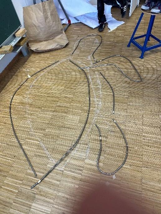 Zuerst wurden aus 10 mm Stahlrundstangen die Konturen geformt. Die Rundstangen wurden von Hand gebogen, mit Trennscheiben getrennt und dann mit Hilfe von Willibald Mittermeier zusammengeschweißt. Dies erforderte hohen körperlichen Einsatz der Schüler.