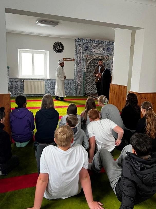 Wir wurden sehr freundlich von Frau Serhat Akin (Frauenbeauftragte), dem Imam Mahmut Bilada und dem zweiten Vorsitzenden Herrn Selcuk Güclü empfangen. Nach einem kurzen Einführungsvideo durften wir den Gebetsraum sehen. Natürlich zogen auch wir unsere Schuhe aus. Der Imam sang uns den bekannten Gebetsruf vor, auch zeigte er uns das alltägliche Morgengebet mit den dazugehörigen Bewegungen und rezitierte frei aus dem Koran. Er kann (einfach) den ganzen Koran auswendig. Wir waren baff.