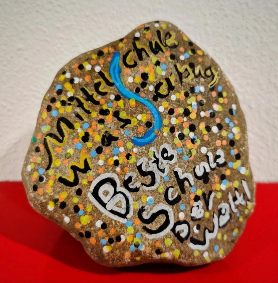 So steht‘s auf einem wunderschön gestalteten großen Stein, der an unserem Sommerfest vor einigen Wochen vor unserer Schule gefunden wurde. Da hat es wohl nicht nur jemandem auf unserem Sommerfest gut gefallen, sondern auch die Zeit in unserer Schule. Obwohl wir leider nicht wissen, wer diesen Stein so schön gestaltet hat, wollte hier jemand seine Wertschätzung für Bildung und die Bedeutung einer guten Schule auf etwas ungewöhnliche Weise zum Ausdruck bringen. Es zeigt auch, wie sehr unsere Gemeinschaft geschätzt wird und wie schön es ist, gemeinsam schöne Momente zu erleben. Natürlich hat dieser Stein nun einen besonderen Platz in unserem Schulhaus. Er liegt nun sichtbar für alle auf Augenhöhe neben dem Eingang zum Sekretariat. Ein schönes wertschätzendes Symbol und tolles Kompliment für die Arbeit unserer Schulfamilie.