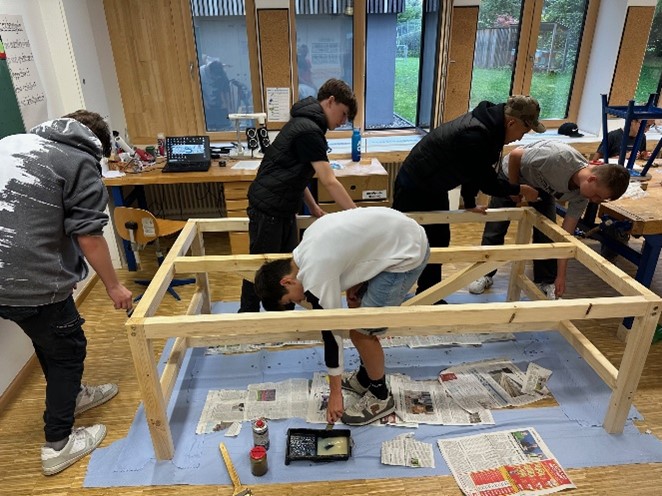 Mit Engagement und handwerklichem Geschick machten sich die Jugendlichen ans Werk. Zunächst wurden Skizzen angefertigt, Materiallisten erstellt und genau ausgerechnet, wie viele Schrauben benötigt werden. Gemeinsam mit ihrem Klassenlehrer Herrn Bauernschmid und dem Sozialpädagogen Herrn Leipold ging es schließlich an die Umsetzung.