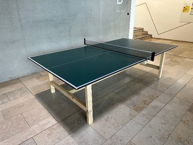 Noch rechtzeitig vor den Sommerferien haben die Schülerinnen und Schüler der Praxisklasse ein Projekt abgeschlossen: Die kaputte Tischtennisplatte in der Aula erstrahlt dank eines selbstgebauten Gestells in neuem Glanz – und das ganz ohne neue Spielfläche, denn diese war zum Glück noch intakt.