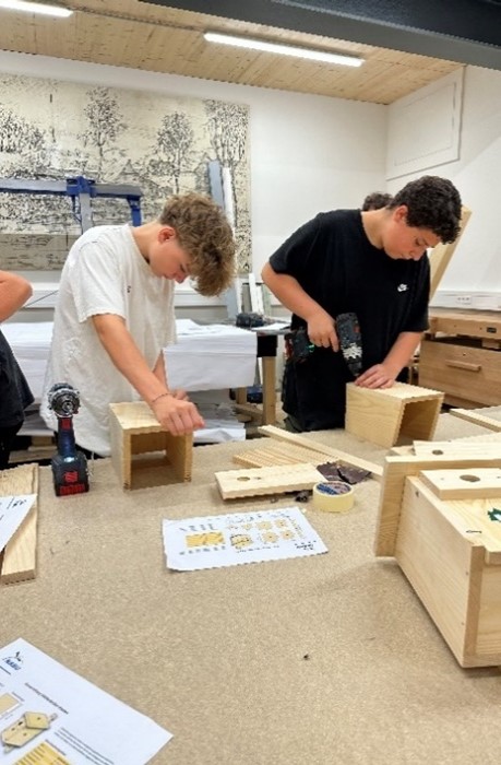 Danach ging es mit den Lehrlingen der Schreinerabteilung zur Arbeit. In Gruppen konnten sie mit dem Fachleuten Vogelhäuser herstellen. Die Lehrlinge standen mit Tipps und Ratschlägen zur Seite.