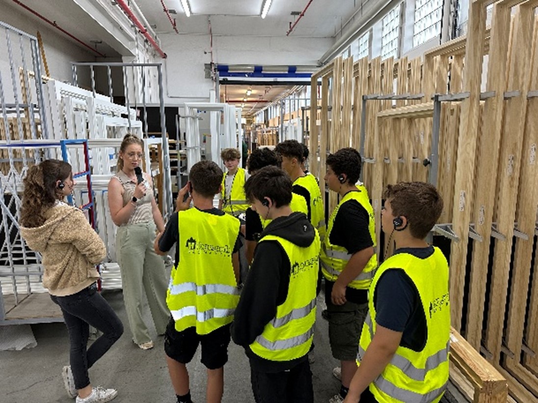 Zu Beginn der Besichtigung wurden wir durch die Produktionshalle des Fensterbaus geführt. Dabei wurde den Schülern der gesamte Fertigungsprozess eines Fensters erklärt – vom Zuschnitt des Holzes über das Einsetzen der Scheiben bis hin zur Endmontage.