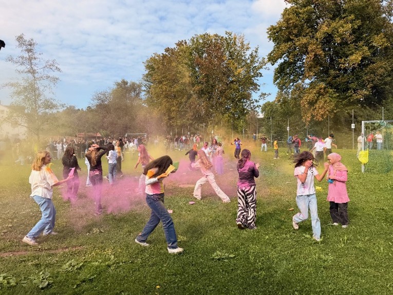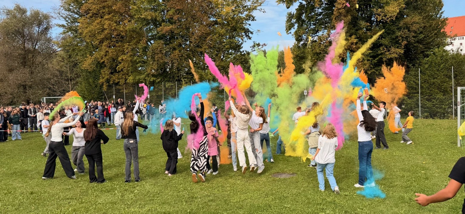 Am Donnerstag, den 2.10.2025 war ein besonderer Tag bei uns an der Mittelschule! Nach einem unterhaltsamen Vormittag mit vielen Spielen und Aktivitäten, bei dem wir uns besser kennenlernen konnten, fand in der 6. Stunde auf der Fußballwiese ein unvergessliches Freudenfest statt – eine Holiparty, die uns alle in einen Farbenrausch versetzte!