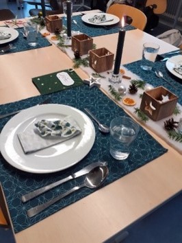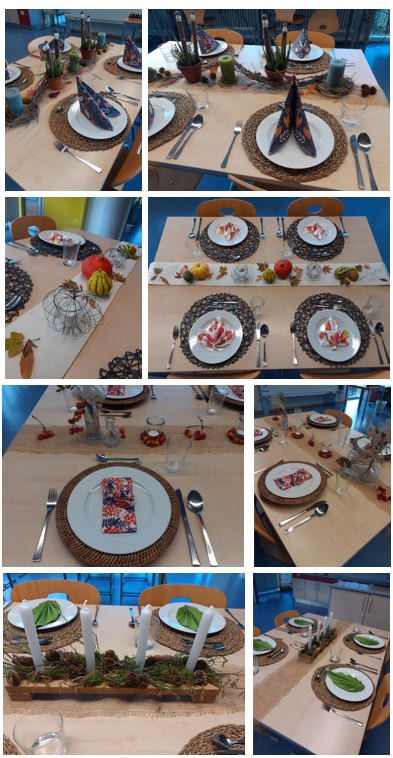 Um dies den Schülerinnen und Schülern zu vermitteln, wurden anhand von vier verschiedenen Mustertischen Tipps und Tricks zur kostengünstigen Tischdeko besprochen. Ziel war es, ihnen zu vermitteln, dass eine geschmackvolle und nachhaltige Deko nicht viel Geld kosten muss und oftmals direkt vor der Haustür oder zumindest im Wald zu finden ist.